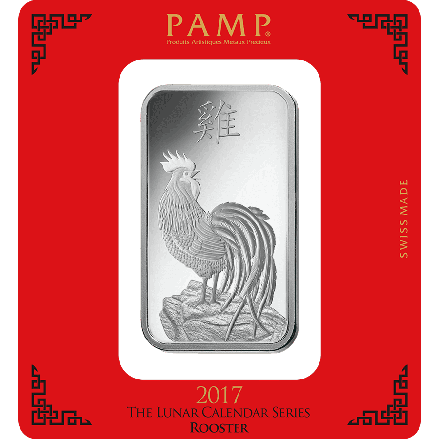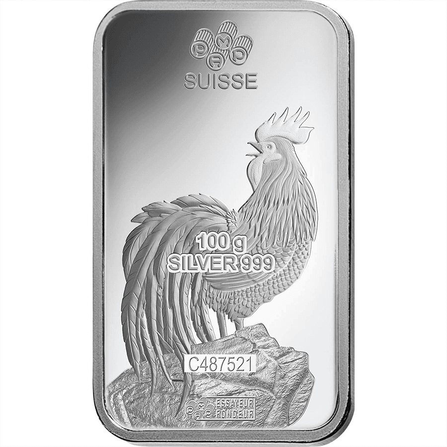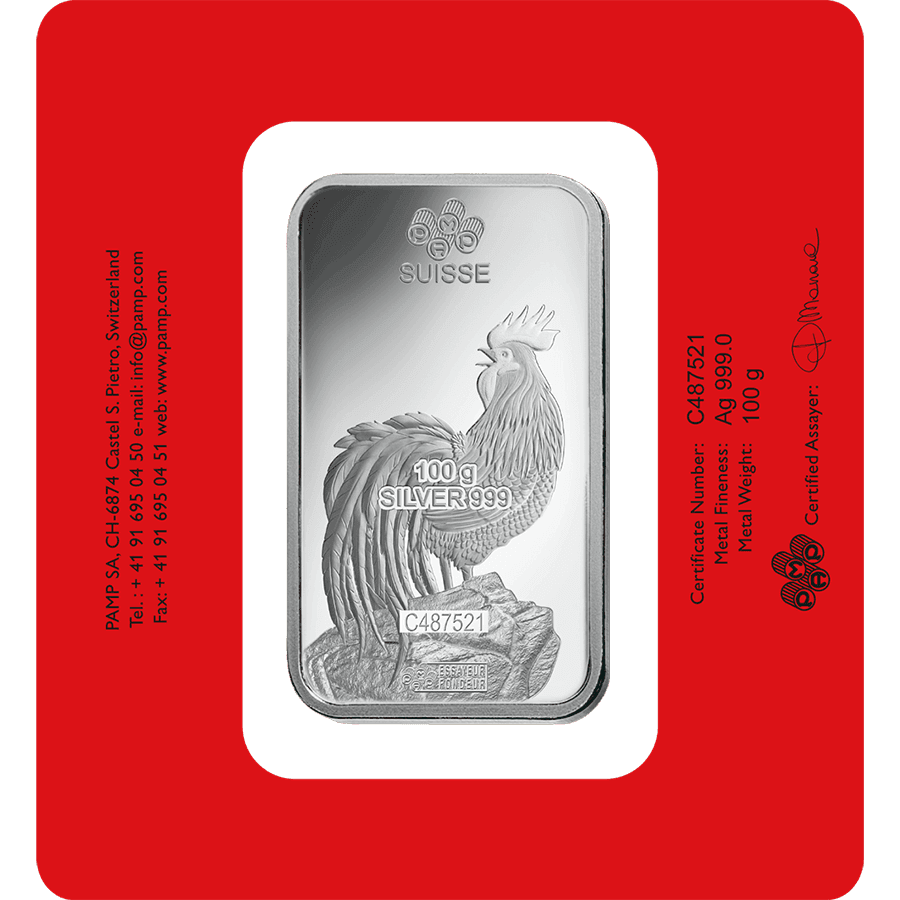 100 Gramm Silberbarren - PAMP Suisse Lunar Hahn