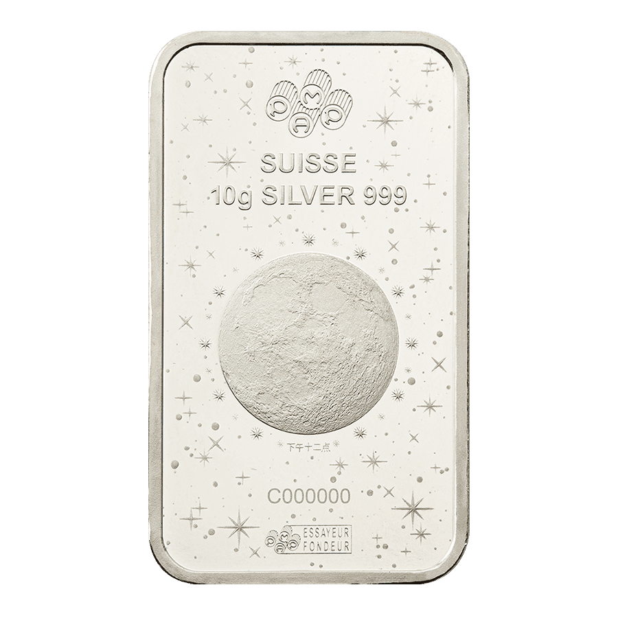 - Rückseite: Eine strahlende Vollmond-Szene erinnert an das chinesische Neujahrsfest, ergänzt durch das PAMP-Logo, Angaben zu Reinheit und Gewicht sowie eine individuelle Seriennummer.
