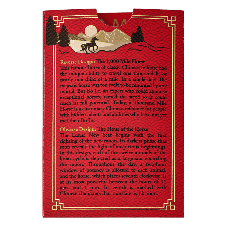 - Vorderseite: Zeigt das legendäre „1.000-Meilen-Pferd“ – ein dauerhaftes Symbol für Stärke und Schnelligkeit – vor einer felsigen Landschaft mit dem chinesischen Schriftzeichen für „Pferd“.