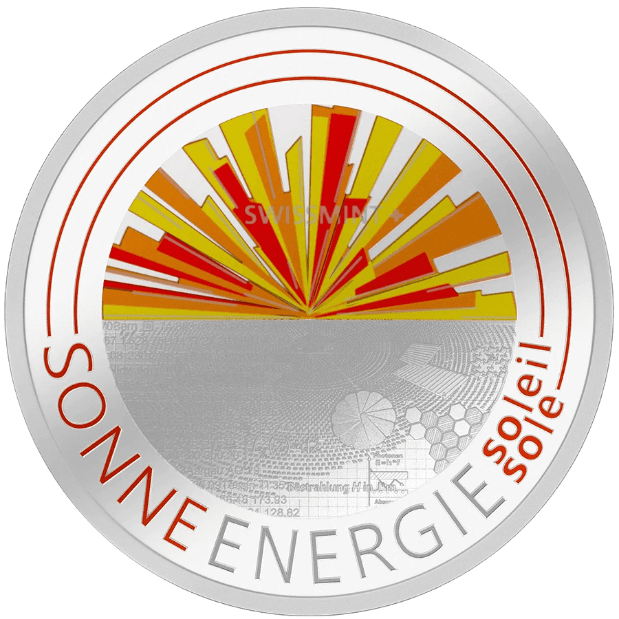 - Rückseite: Zeigt ein strahlendes Sonnenmotiv mit leuchtend orangefarbenen und gelben Strahlen sowie feinen technischen Gravuren zur Darstellung von Solarenergie. Die Inschrift „SONNENENERGIE soleil sole“ in Deutsch, Französisch und Italienisch leuchtet im Dunkeln – ein innovativer Blickfang.