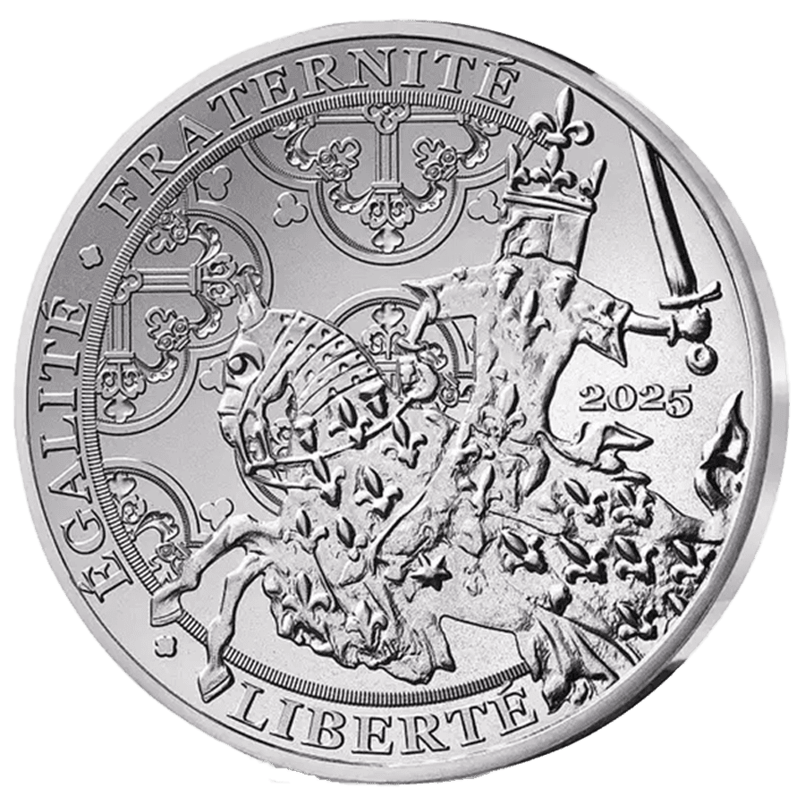 - Vorderseite: Zeigt König Jean II. „le Bon“ zu Pferd – eine originalgetreue Wiedergabe des Franc à cheval von 1360. Mit der Inschrift „Liberté Égalité Fraternité“ und dem Prägejahr 2025.
