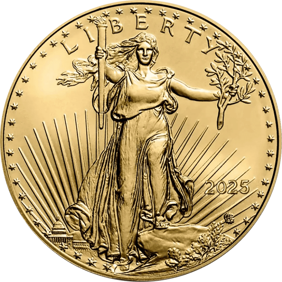 - Obverse: Features the iconic depiction of Lady Liberty, designed by Augustus Saint-Gaudens. She holds a torch in one hand and an olive branch in the other, symbolizing enlightenment and peace. The background features sun rays and the U.S. Capitol building, with the inscription "LIBERTY" at the top and the year "2025" on the right.