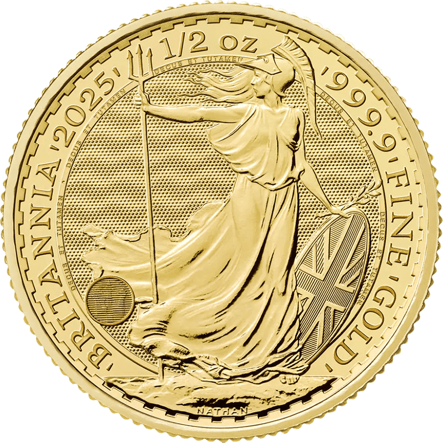 - Reverse: Showcases the iconic Britannia design, symbolizing strength and resilience. The image includes advanced security features such as micro-detailing, a latent image, and surface animation. The inscriptions read "BRITANNIA," "2025," "1/2 oz," and "999.9 FINE GOLD."