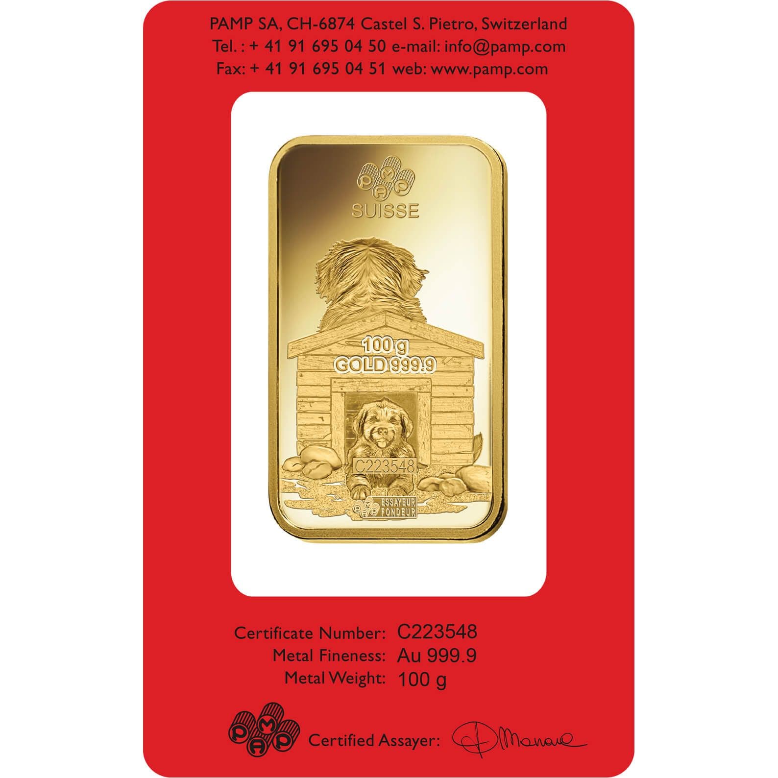 100 gram Gold Bar - PAMP Suisse Lunar Dog