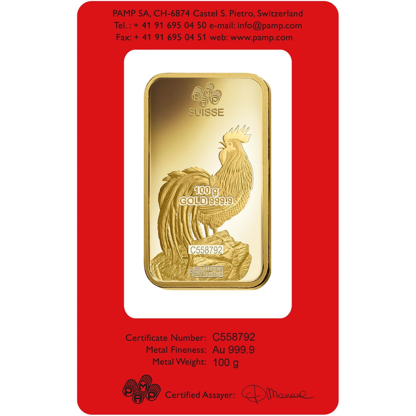 100 gram Gold Bar - PAMP Suisse Lunar Rooster