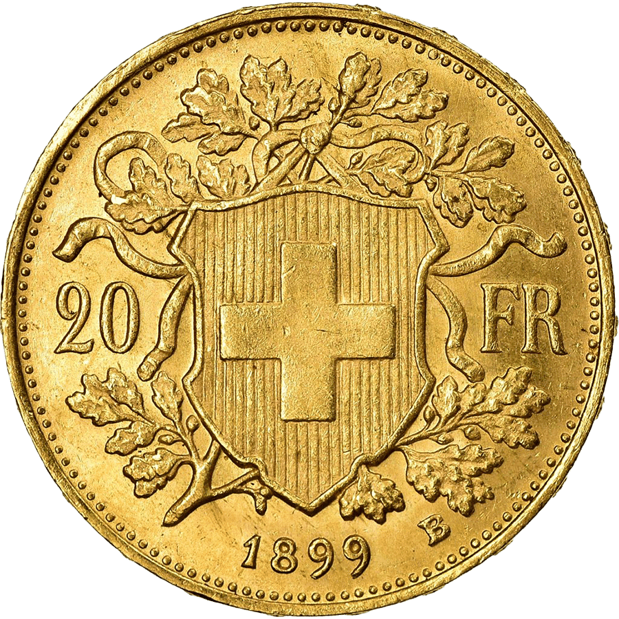 - Reverse: Displays the Swiss shield with a cross in front of an oak branch, surrounded by the denomination “20 FR” and the year “1899.”