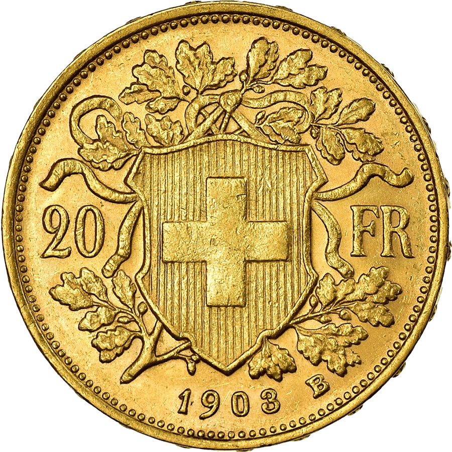 - Reverse: Displays the Swiss shield with a cross in front of an oak branch, surrounded by the denomination “20 FR” and the year “1903.”