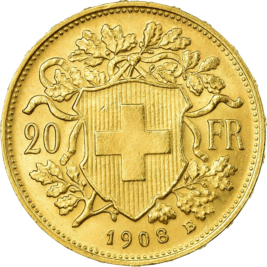 - Reverse: Displays the Swiss shield with a cross in front of an oak branch, surrounded by the denomination “20 FR” and the year “1908.”
