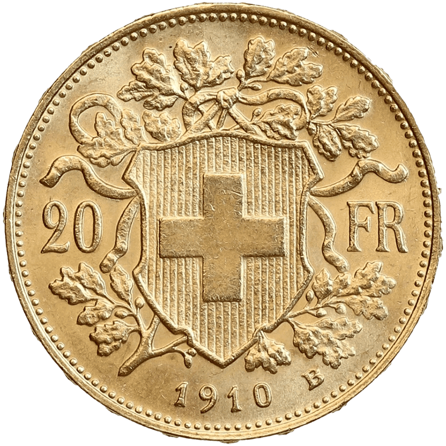 - Reverse: Displays the Swiss shield with a cross in front of an oak branch, surrounded by the denomination “20 FR” and the year “1910.”