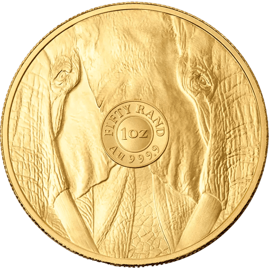 - Reverse: Displays two halves of an elephant’s head. When two coins are placed side by side, they form a full elephant face. When multiple coins are arranged together, they create the illusion of a herd. The center of the coin bears the inscriptions "FIFTY RAND," "1OZ," and "Au 999.9."