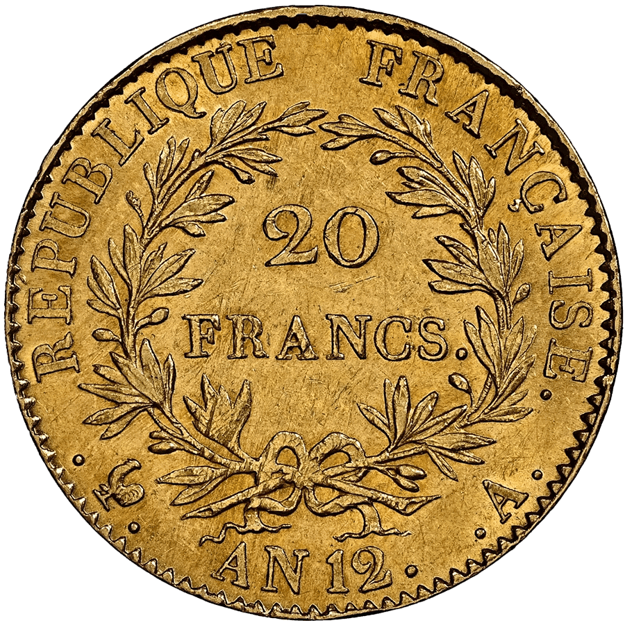 - Reverse: Shows the denomination “20 FRANCS” and the Revolutionary calendar year (AN 12–14), encircled by a laurel wreath and the inscription “RÉPUBLIQUE FRANÇAISE.”