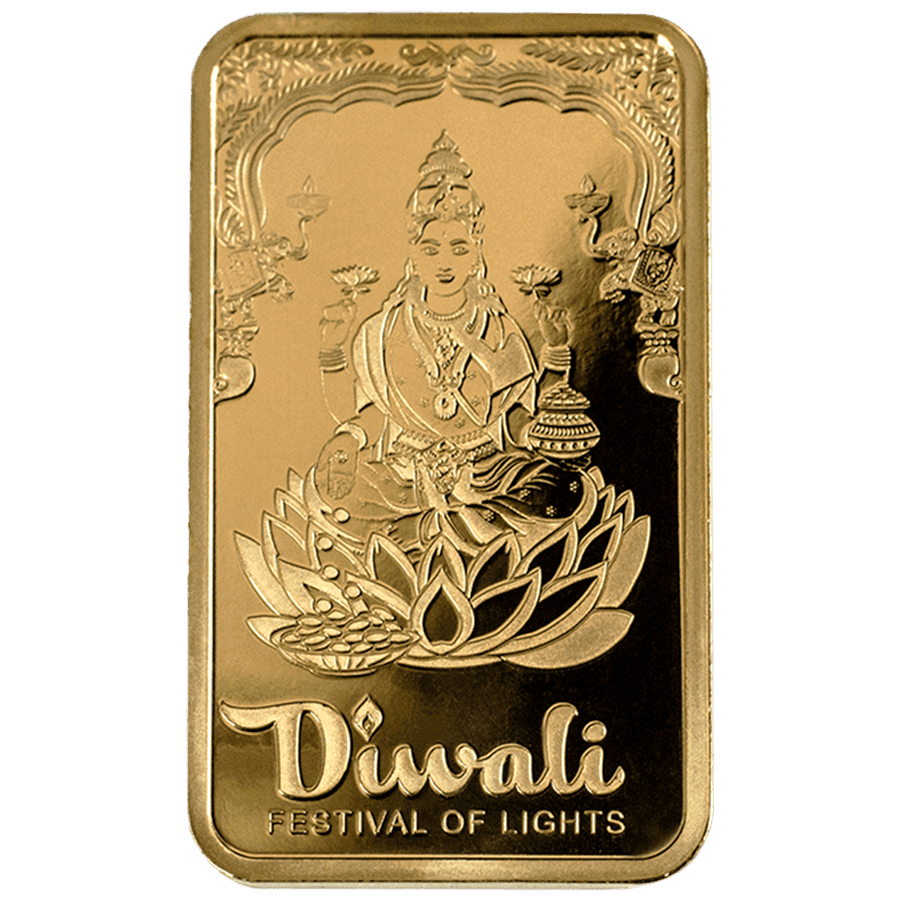 The Diwali gold bar design beautifully captures the essence and spirit of the Festival of Lights. On this limited edition Diwali gold bar, Lakshmi is elegantly portrayed in a lotus flower, her right hand making the Abhaya Mudra sign for protection.