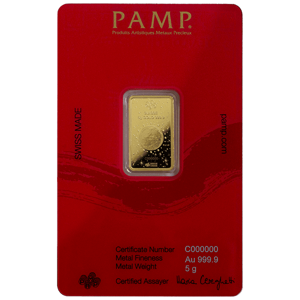 This 5 gram Lunar Dragon fine gold bar is a part of the PAMP Lunar products range. It measures 14 mm in length and 23.3 mm in height, with a thickness of 0.83 mm. It’s crafted from the highest-quality gold with a purity of 999.9‰. Just like all other Lunar Calendar ingots, this gold Lunar Dragon bar is sealed in red CertiPAMP packaging with gold-colored lettering.