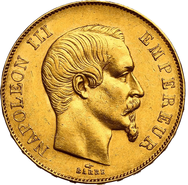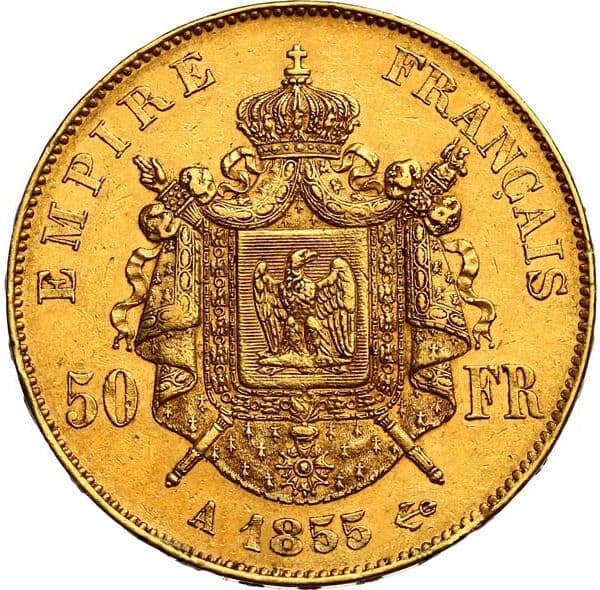 This gold coin of 0.4667 of an ounce, or 14.51 grams (g), was the first 50 Franc Gold coin to be created by the decree of December 12, 1854, it is also the first coin of the Second Empire ruled by Napoleon III.
