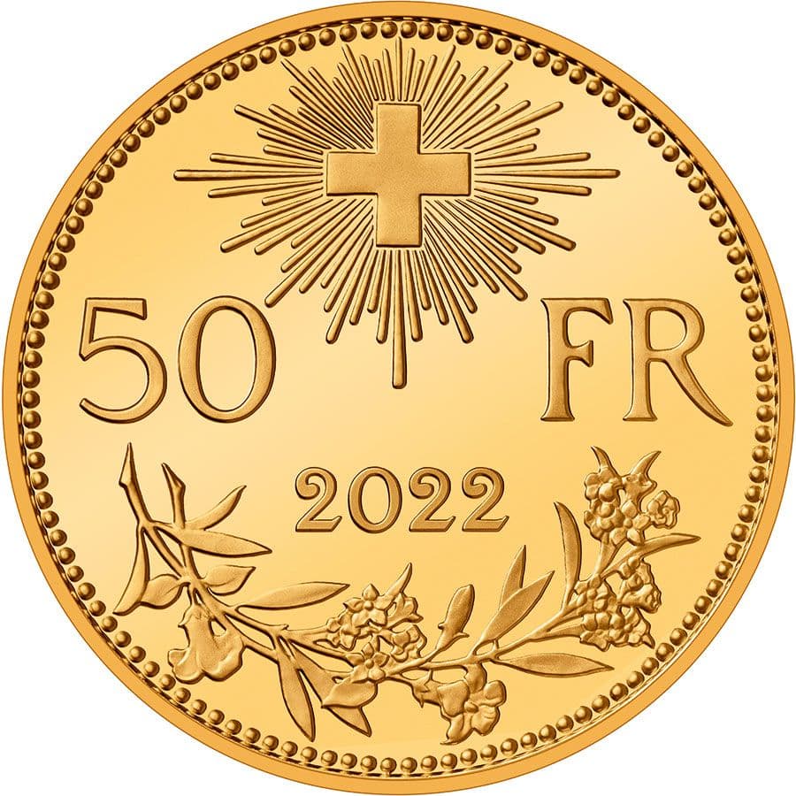 The upper part still shows the Swiss cross in the middle of a halo, with the 10 Fr denomination now changed to 50 Fr and the year to 2022.