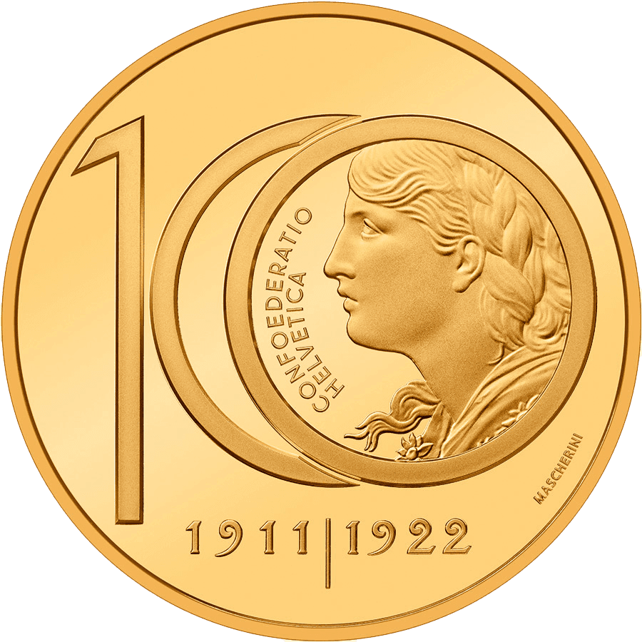 In front of her, we see the inscription “Confoederatio Helvetica”, and just underneath, we can see, separated by a vertical bar, the years 1911 and 1922, for the period when the Vreneli 10 franc coin was issued.