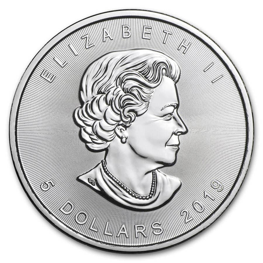 The reverse of the 1 oz silver Maple Leaf coin features the iconic image of Queen Elizabeth II, designed by Susanna Blunt.