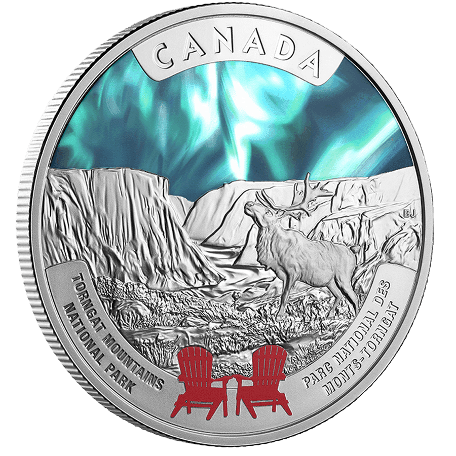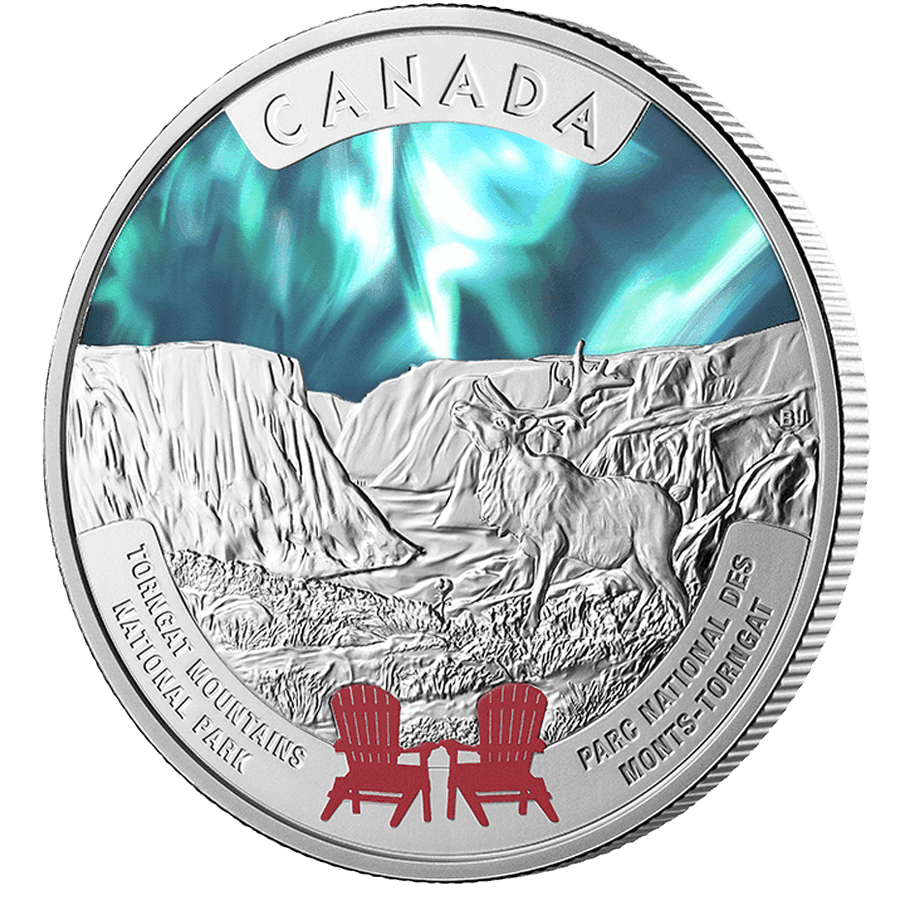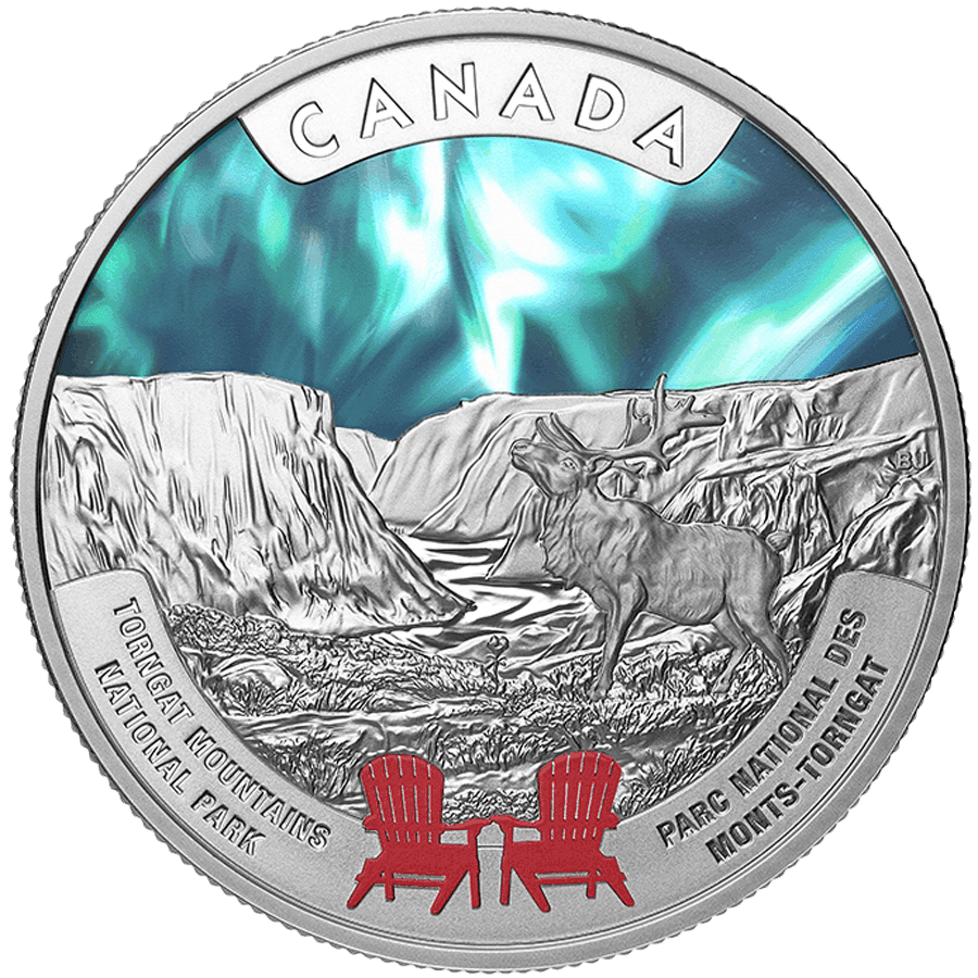 - Reverse: Depicts a majestic caribou standing in the dramatic landscape of Torngat Mountains National Park, surrounded by towering cliffs and glacial terrain. The sky is enhanced with vibrant selective colour, representing the northern lights. The design also features the iconic red Parks Canada chairs in the foreground, along with inscriptions including "CANADA" and the park’s name.