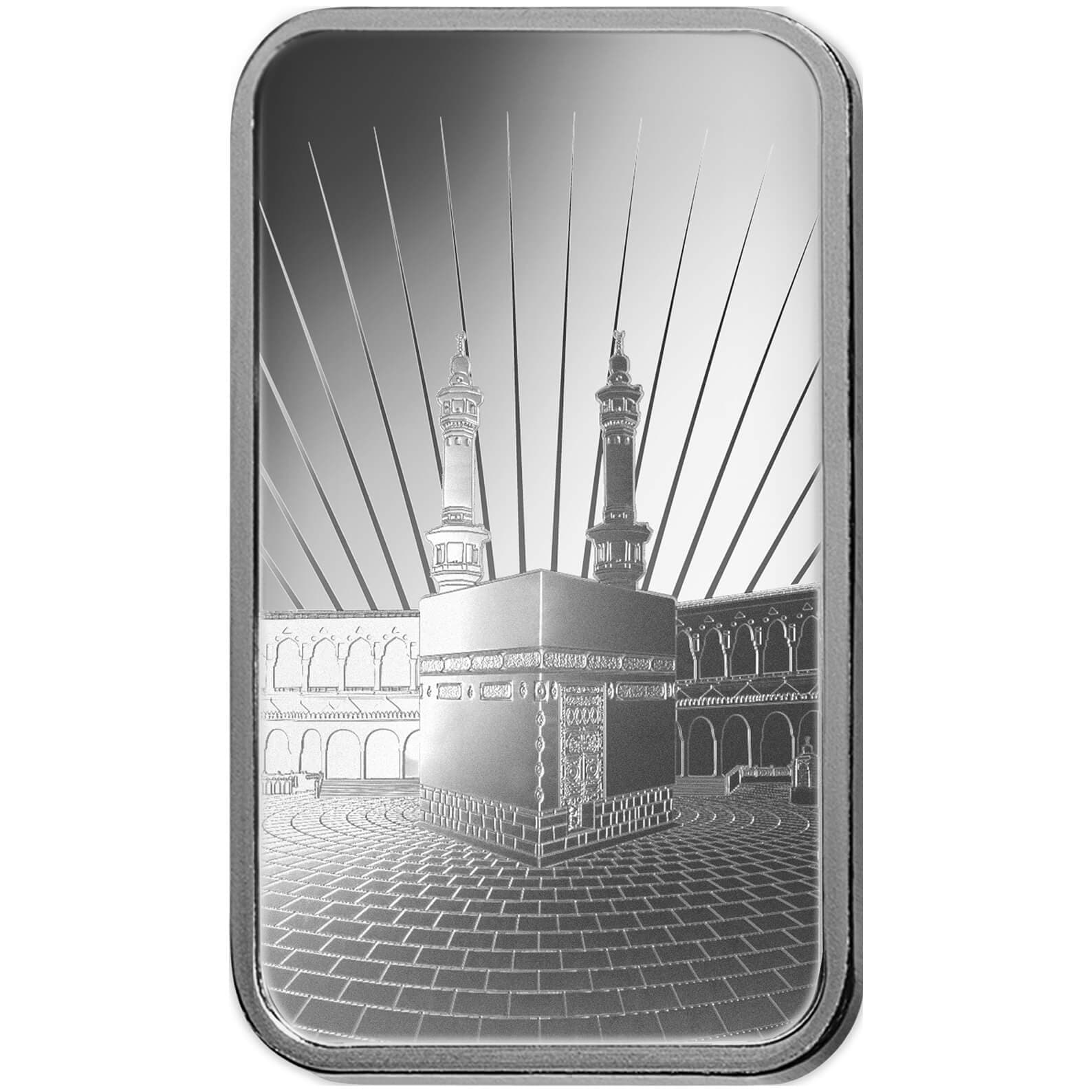 The beautiful religious ingot in silver of 10 gram, represents Ka'Bah Mecca. The reverse features its weight, purity and a unique serial number.