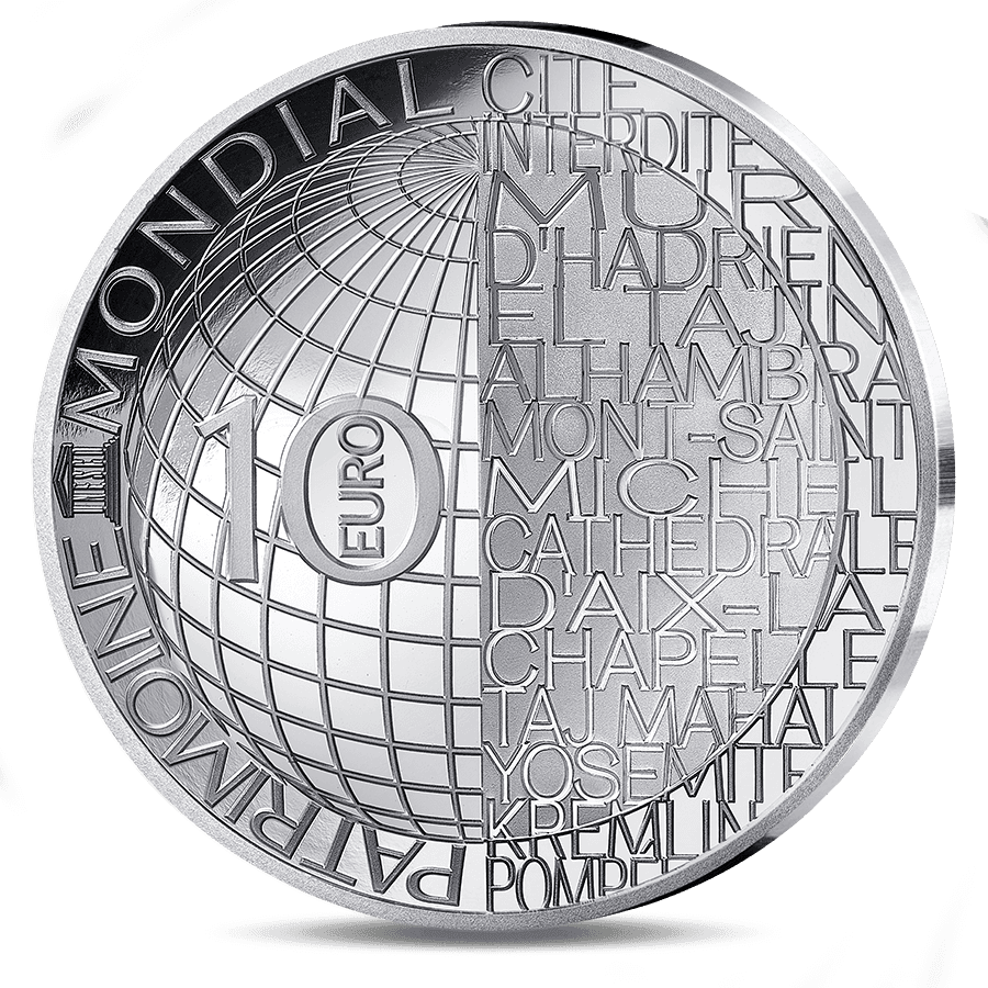 - Reverse: A stylized globe marked with the names of UNESCO World Heritage sites, the initials “RF” for République Française, and the face value of €10.