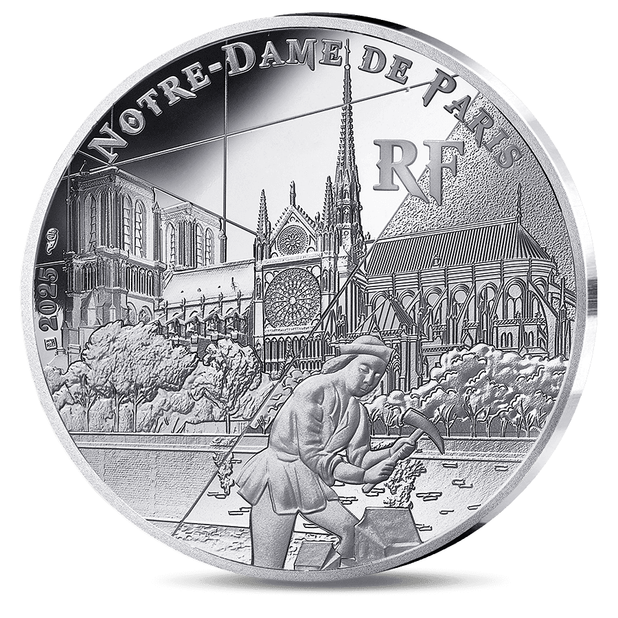- Obverse: Features Notre-Dame de Paris with detailed engraving of the cathedral’s façade and towers. A stonemason in the foreground pays tribute to the rebuilding efforts following the 2019 fire.