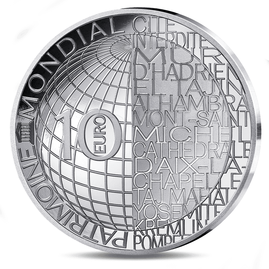 - Reverse: A stylized globe with names of UNESCO World Heritage sites, along with the initials “RF” for République Française and 10 EUR face value.