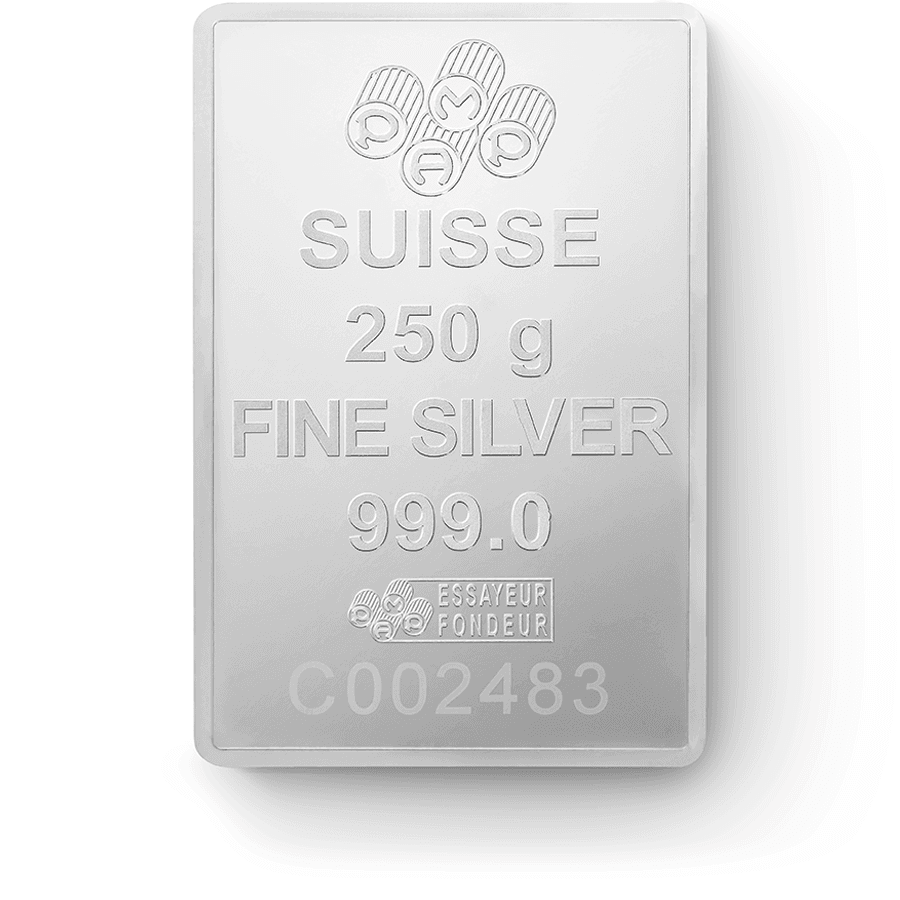 This 250-gram silver bullion produced by PAMP has a millesimal fineness of 999.0 silver content.