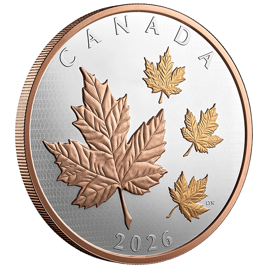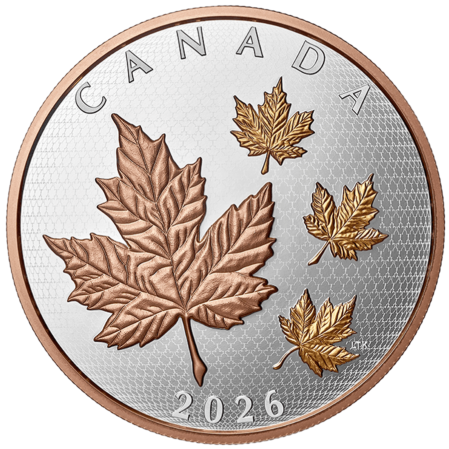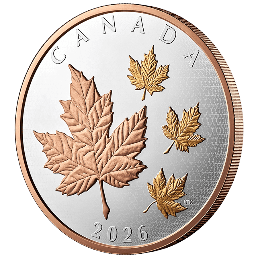 - Reverse: Showcases Canada’s iconic maple leaf in a dynamic composition, enhanced with dual-tone 24k gold plating in rose gold and yellow gold. The central large maple leaf is complemented by smaller leaves in motion, creating depth and movement, with the inscription "CANADA" and the year "2026".