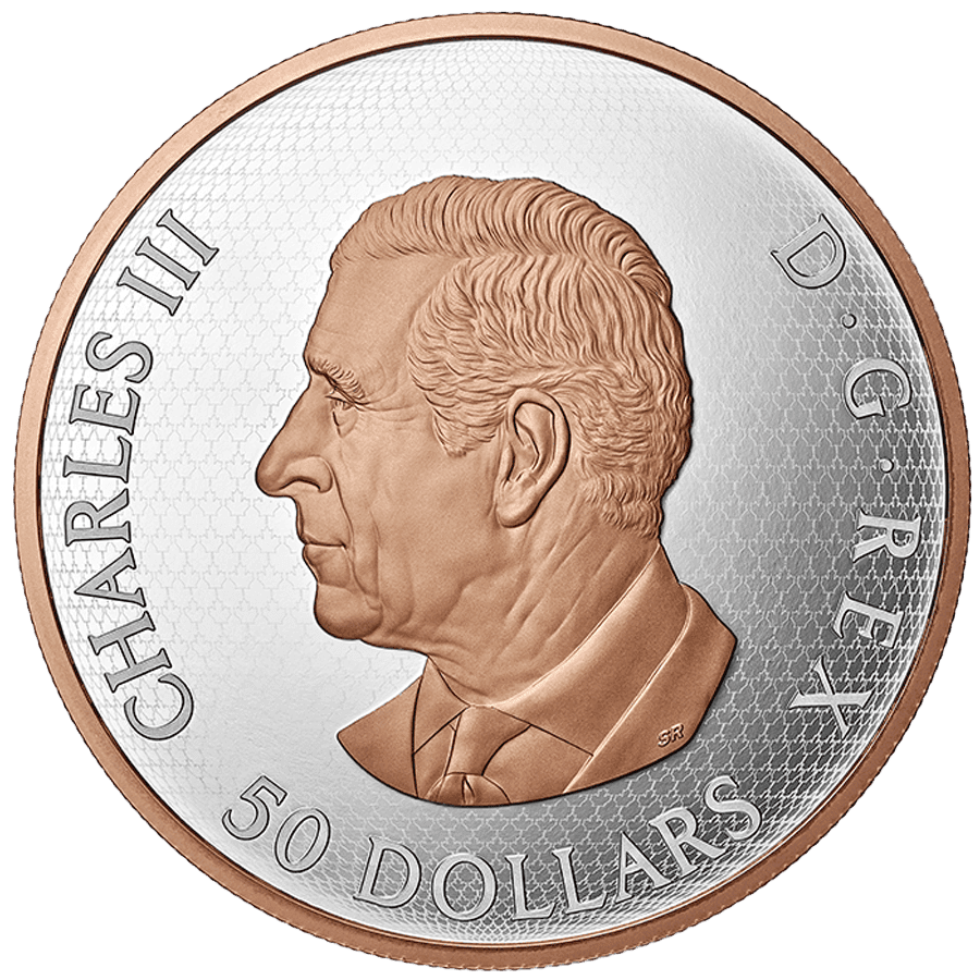 - Obverse: Features the effigy of King Charles III with a refined rose gold plated portrait and rim, along with the inscriptions "CHARLES III" and "50 DOLLARS", creating a warm contrast against the silver background.