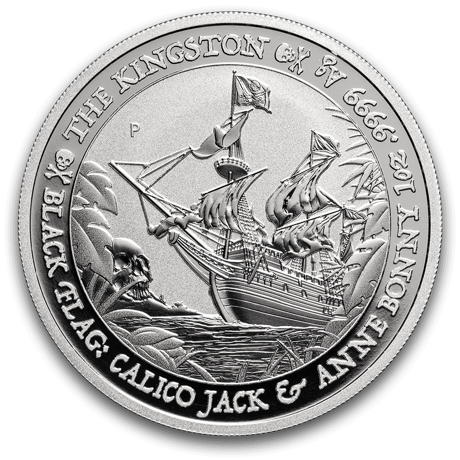 - Revers : Représente le navire marchand Le Kingston voguant de manière menaçante vers une côte tropicale sous le tristement célèbre drapeau pirate. Une tête de mort de pirate apparaît à l’horizon, accompagnée des inscriptions « THE KINGSTON » et « BLACK FLAG: CALICO JACK & ANNE BONNY ».