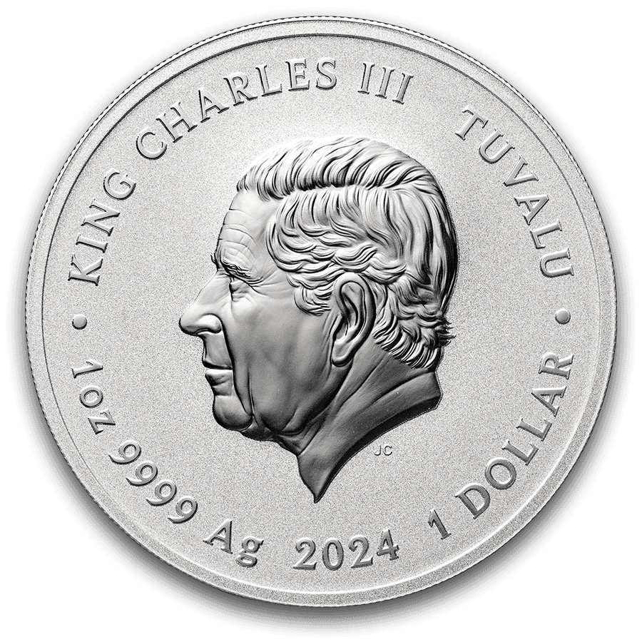- Avers : Affiche l’effigie officielle du roi Charles III, entourée des inscriptions « KING CHARLES III », « TUVALU », « 1 OZ 9999 Ag », « 2024 » et la valeur faciale « 1 DOLLAR ».