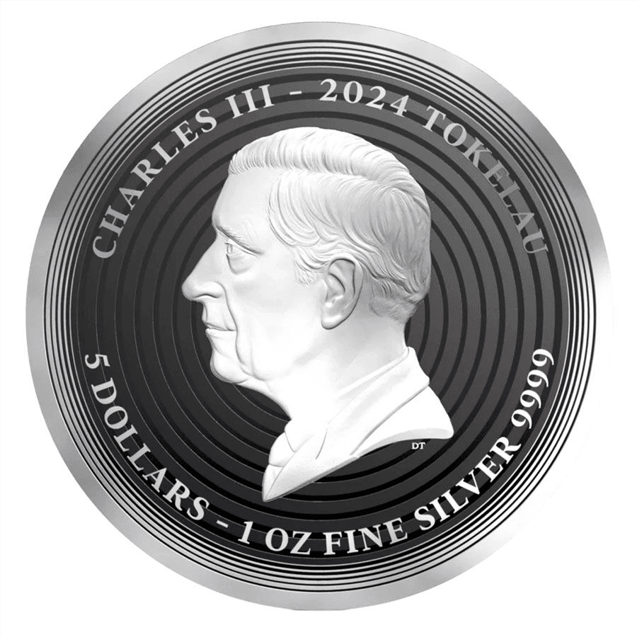 - Avers : Représente le roi Charles III accompagné des inscriptions « CHARLES III », « 2024 », « TOKELAU », « 5 DOLLARS » et « 1 OZ FINE SILVER 9999 », confirmant son statut de monnaie légale.