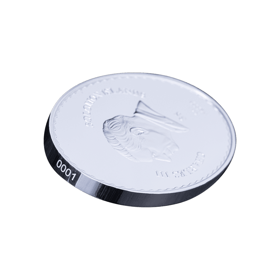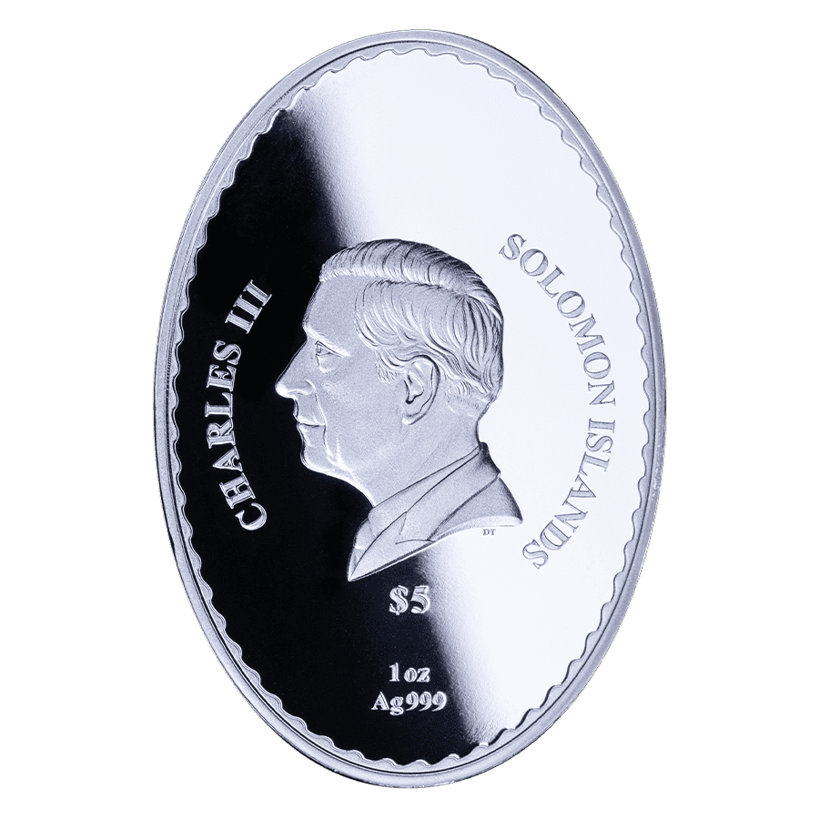 - Avers : Présente l’effigie du roi Charles III, accompagnée des inscriptions « CHARLES III », « SOLOMON ISLANDS », « 1 oz », « Ag 999 » ainsi que « 5 $ » pour la valeur faciale.