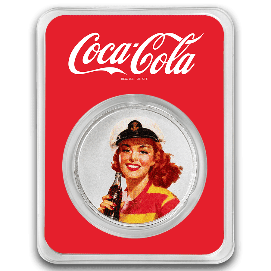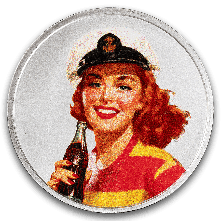 Cette pièce d'argent colorée de 1 once célèbre l'époque publicitaire nostalgique des années 1930-1940 de Coca-Cola®. Représente l'image classique d'une jeune femme matelote et se trouve dans un emballage TEP protecteur. Il s'agit d'une excellente pièce de collection ou d'un cadeau pour les amateurs de Coca-Cola®. Ajoutez cette pièce remarquable à votre collection dès aujourd'hui !