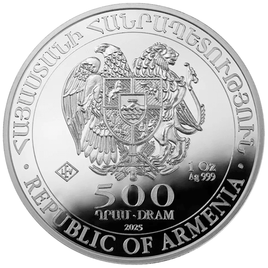 - Avers : Les armoiries de la République d'Arménie sont finement gravées, représentant un aigle et un lion tenant un bouclier décoré de l'Arche de Noé en son centre. Les inscriptions incluent « 500 Dram », le poids « 1 oz », la pureté « Ag 999 » et l'année « 2025 ».