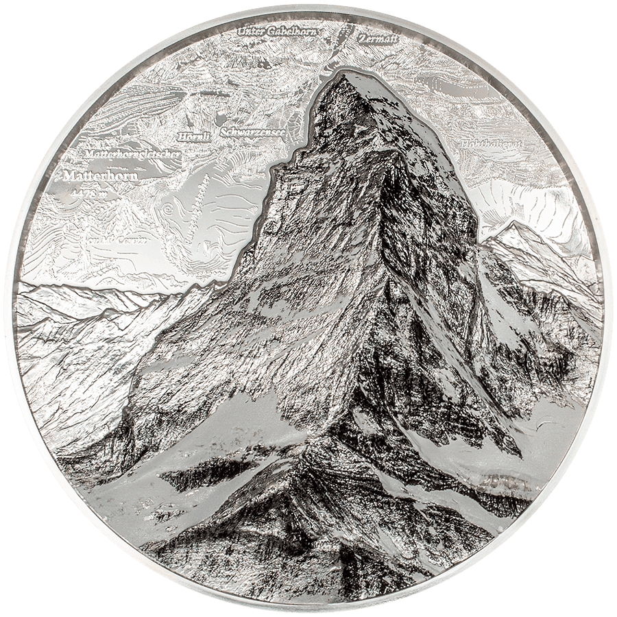 - Revers : Met en valeur une gravure en ultra haut relief du Cervin, donnant à la montagne une apparence tridimensionnelle saisissante. Le paysage environnant est minutieusement détaillé avec une carte topographique incluant des lieux emblématiques comme Zermatt.