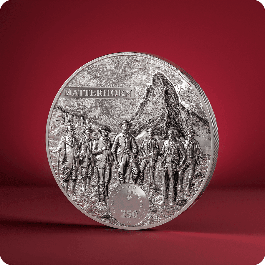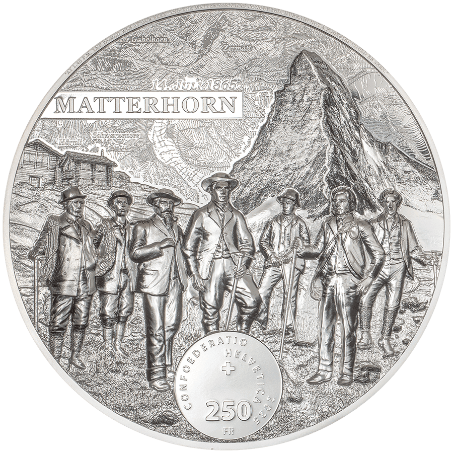 - Avers : Présente une gravure détaillée du Cervin (Matterhorn), accompagnée d’un groupe d’alpinistes vêtus d’équipements historiques, en hommage à la première ascension réalisée le 14 juillet 1865. L’inscription « Matterhorn » est mise en avant, accompagnée de la valeur faciale 250 CHF et de « CONFŒDERATIO HELVETICA ».