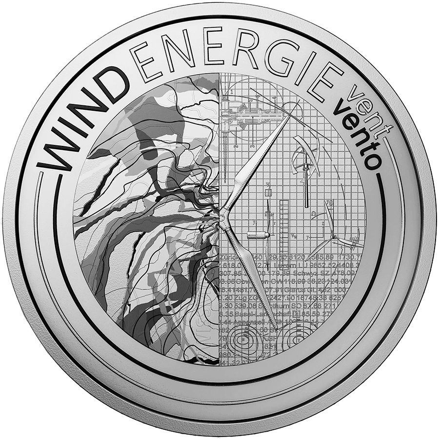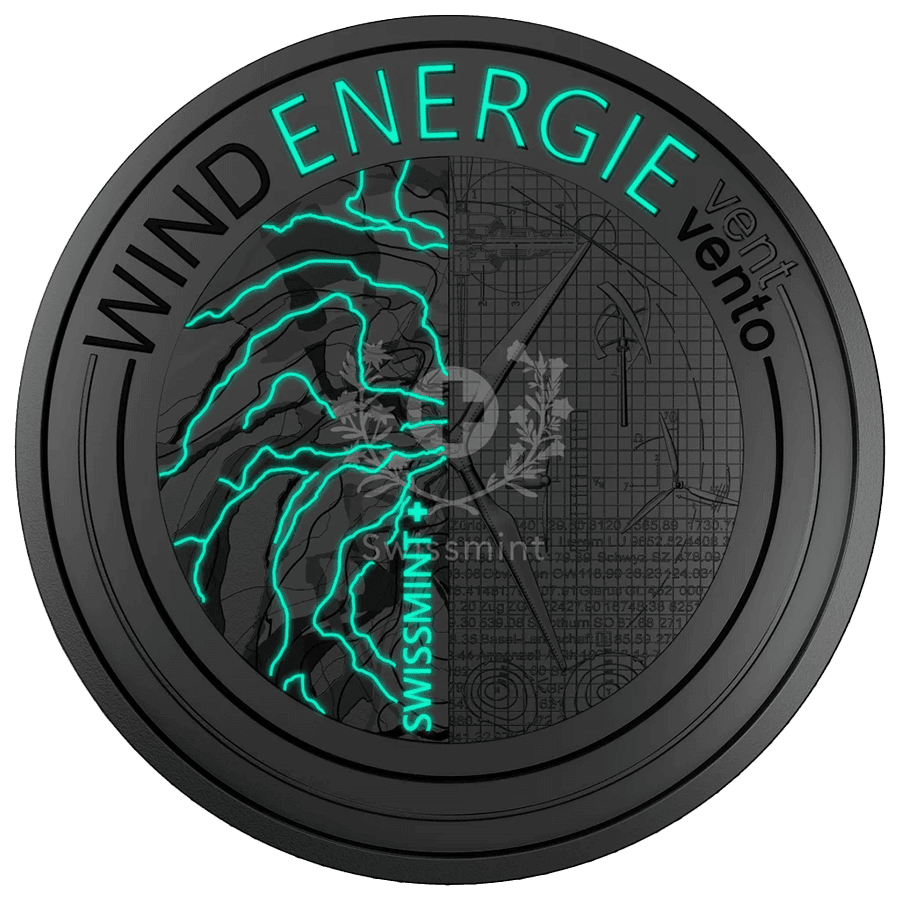 - Revers : Présent un design saisissant inspiré du vent, entre une carte stylisée des vents et une grille technique. Une éolienne domine la composition, tandis que l'inscription “WIND ENERGIE vent vento” en trois langues brille dans l’obscurité, un élément à la fois captivant et futuriste.