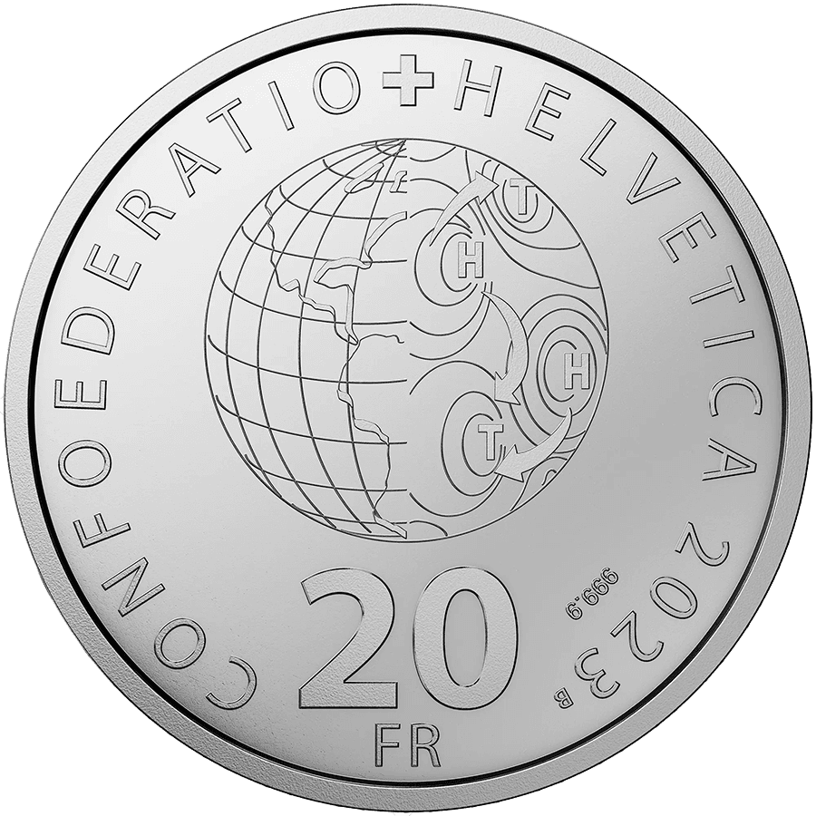 - Avers : Représente la croix suisse entourant le globe terrestre décoré de courants d'air tourbillonnants, avec l'inscription “CONFOEDERATIO HELVETICA 2023” ainsi que la valeur faciale “20 FR” en bas.