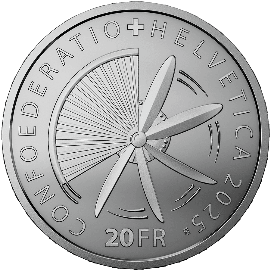 - Revers : Présente une hélice d’avion avec l'inscription « CONFOEDERATIO HELVETICA 2025 » et la valeur faciale de 20 francs suisses (20 FR).