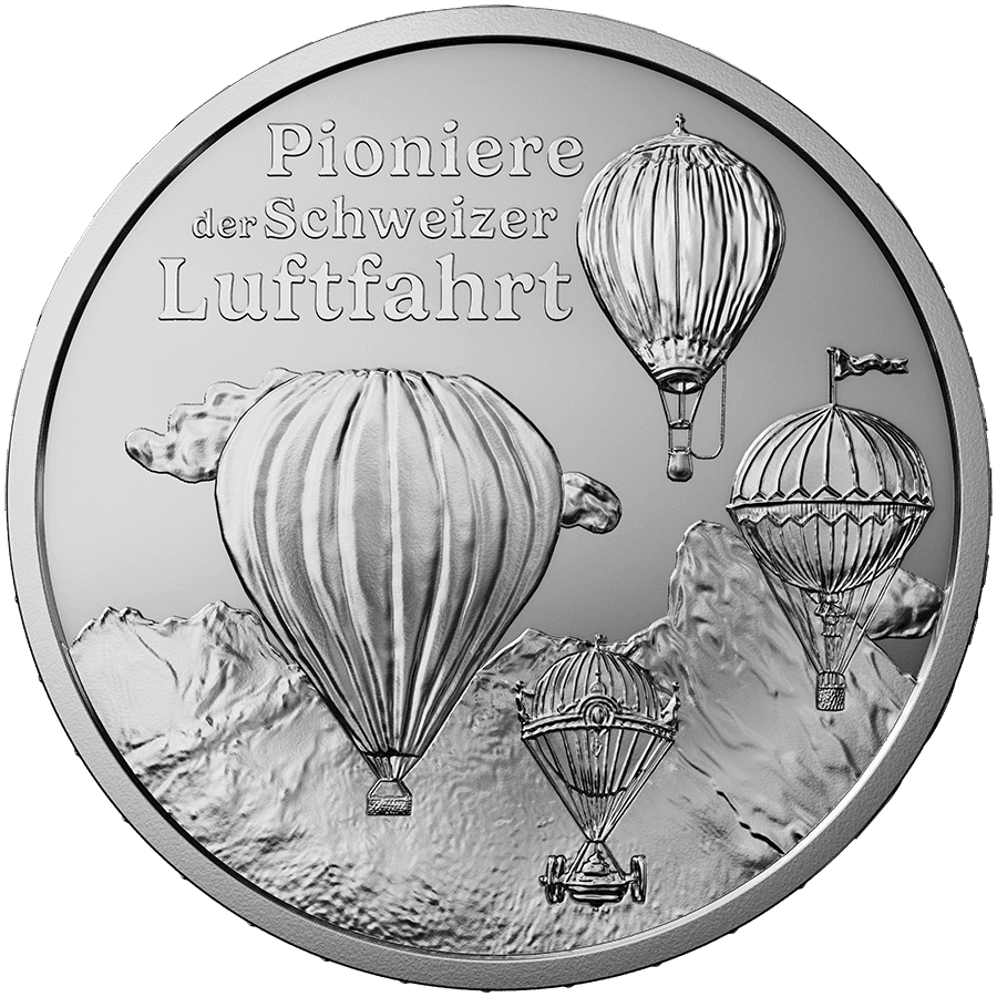 - Avers : Réprésente des montgolfières au-dessus des Alpes suisses avec l’inscription « Pioniere der Schweizer Luftfahrt ».