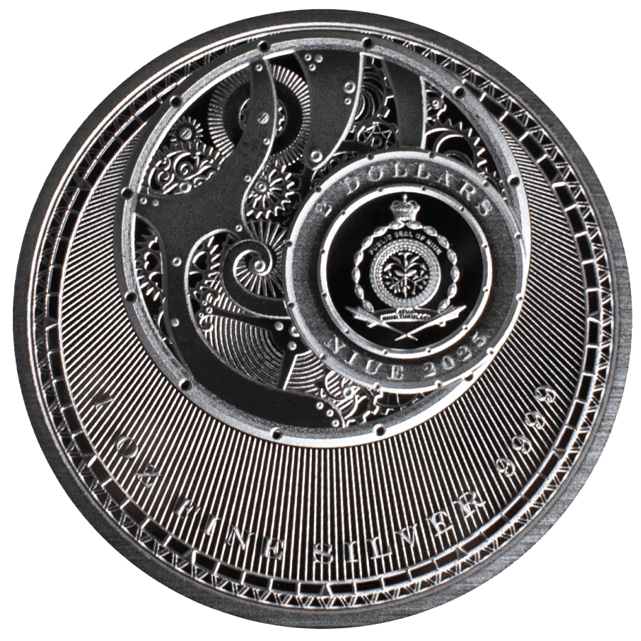 - Revers : Présente un motif mécanique stylisé avec des détails en forme d’engrenages ainsi que les armoiries officielles de Niue au centre. Les inscriptions « 2 DOLLARS », « NIUE 2025 » et « 1 oz FINE SILVER 999.9 » sont intégrées harmonieusement au design.
