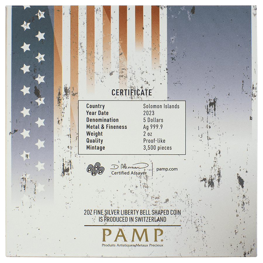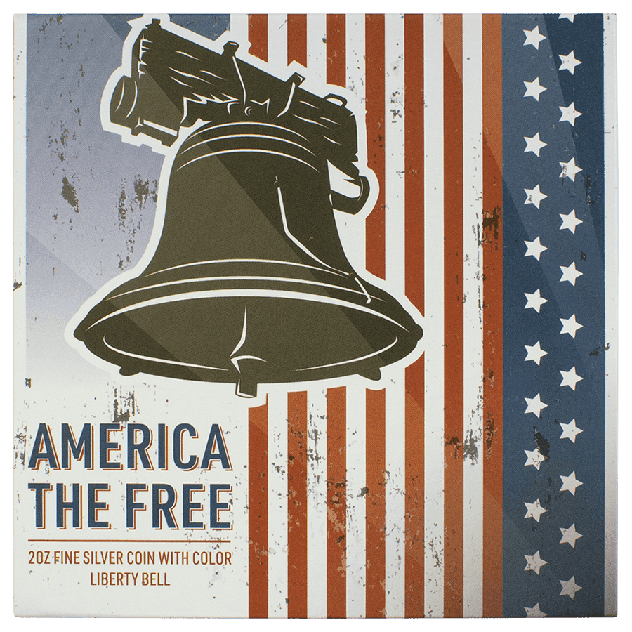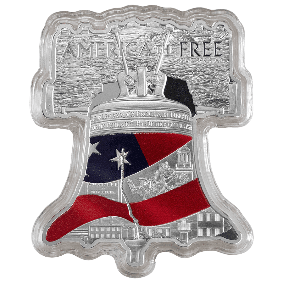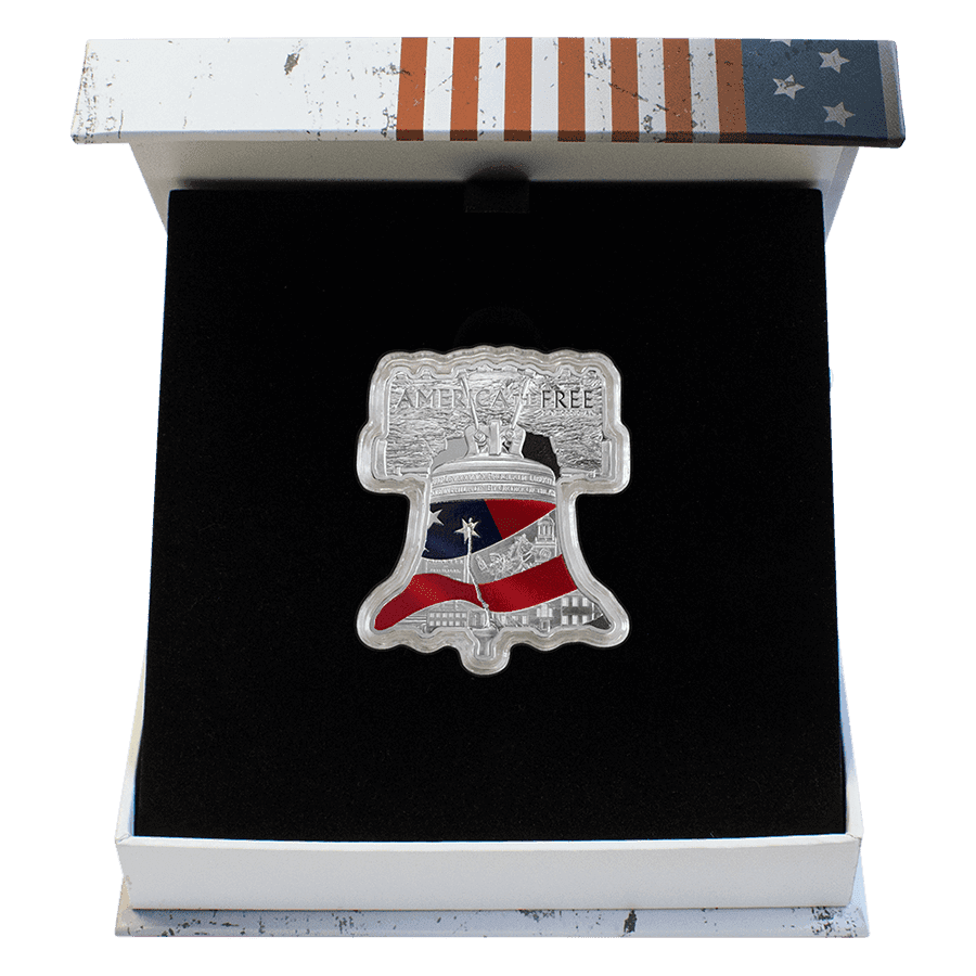 Cette pièce en argent America the Free représente la “Liberty Bell”, ou “Cloche de la Liberté” en français, aux couleurs du drapeau américain. Sur cette dernière sont gravés le portrait du patriote Paul Revere lors de sa célèbre “Midnight Ride”, ainsi que l’Independence Hall, un autre symbole de liberté.