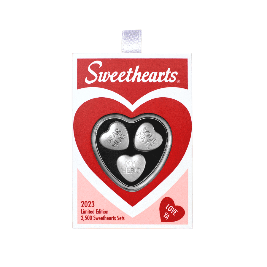 Les bonbons Sweethearts transmettent des mots d'amour depuis plus de 100 ans. PAMP, une raffinerie de métaux précieux réputée, vient de lancer une série limitée de trois répliques de 10 grammes de bonbons Sweethearts en argent pur, gravés de tous nouveaux petits mots d'amour datant de 2023.