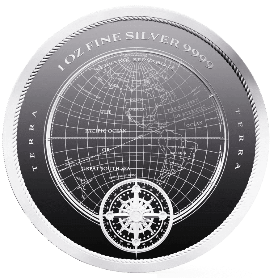 - Avers : Présente un globe effet miroir avec des lignes de latitude et de longitude détaillées, accompagné d’une rose des vents. L'inscription indique « 1 oz FINE SILVER 999.9 ».