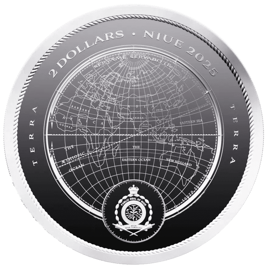 - Revers : Représente une projection cartographique de la Terre, la valeur faciale « 2 DOLLARS », le pays émetteur « NIUE 2025 » ainsi que les armoiries officielles du pays.