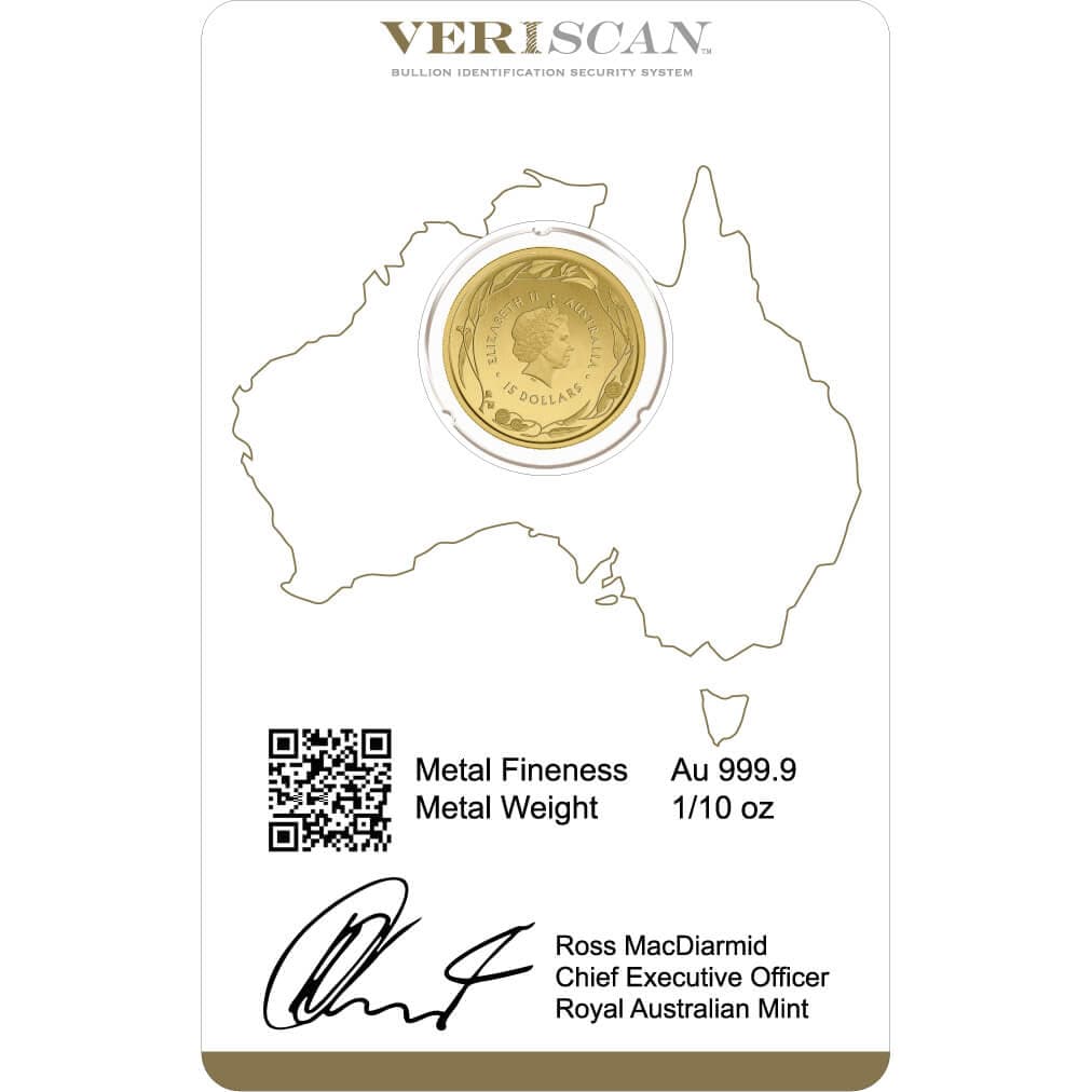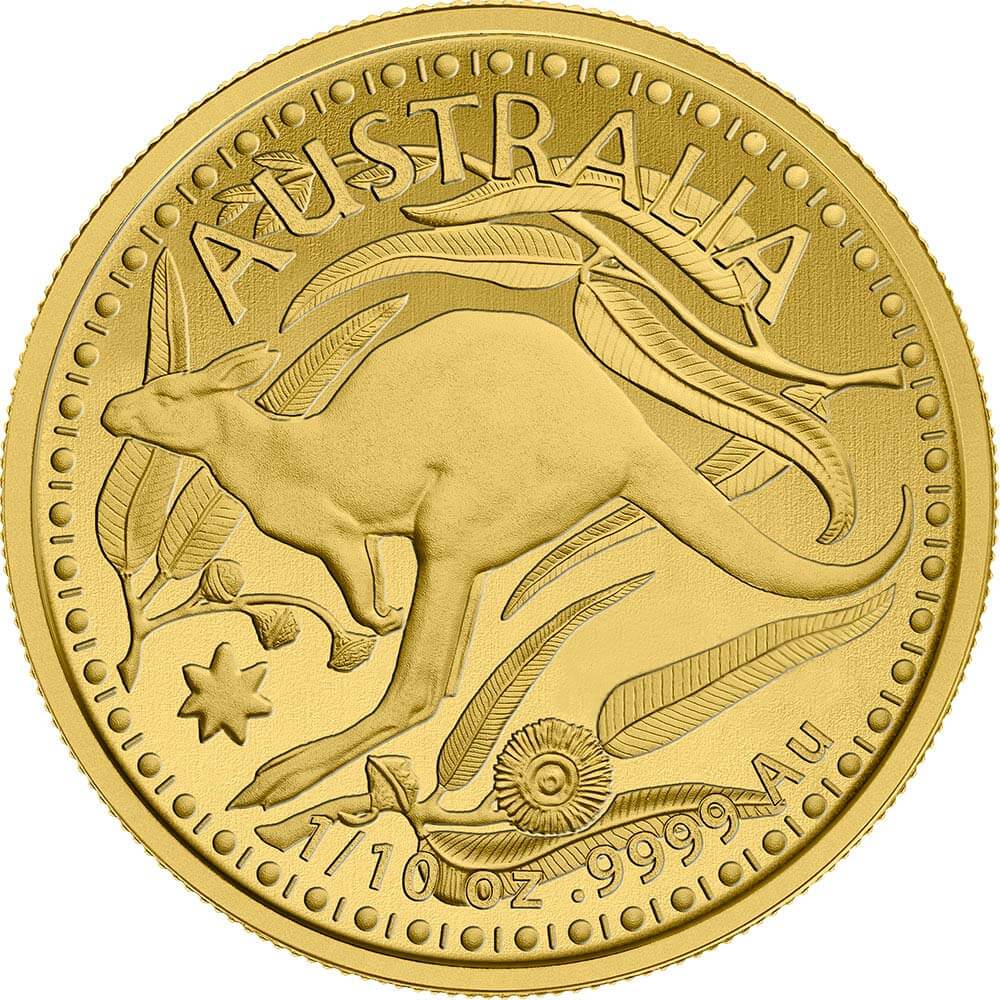 Cette pièce de 1/10 d’once (oz) d'or, soit 3,11 grammes (g), “Kangaroo” est produite par la “Royal Australienne Mint”. Le design de ces pièces de monnaie acclamées internationalement, représente maintenant l'héritage australien. Autrefois, ce même design se retrouvait l’une des premières petites pièces de monnaie australiennes.