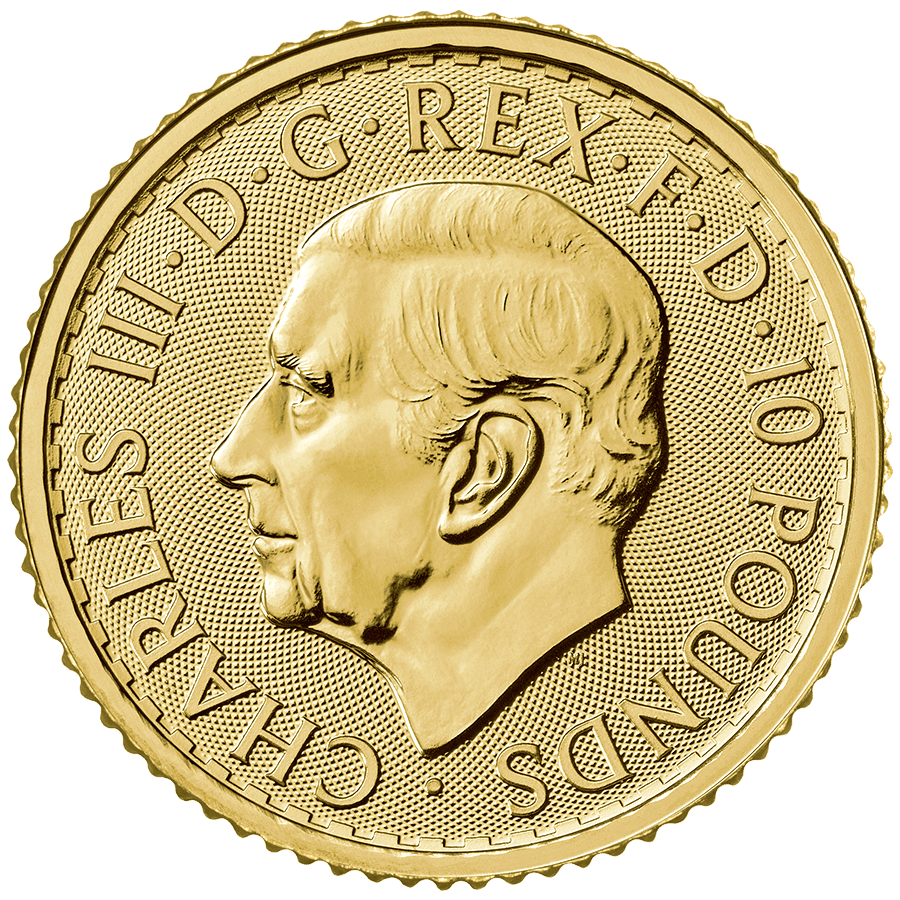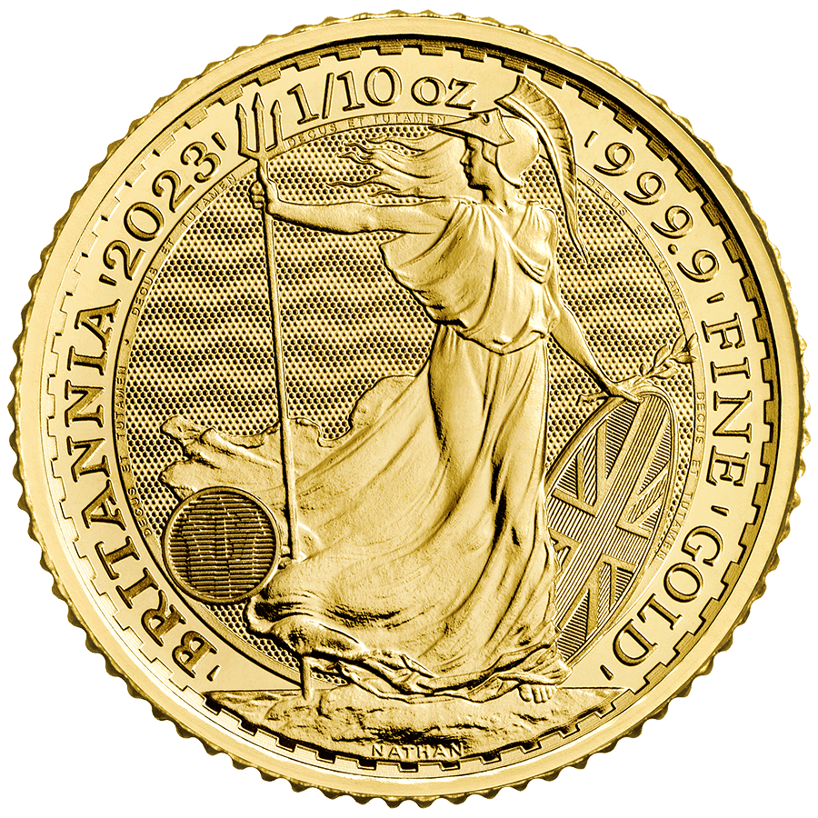 La pièce d’or 1/10 once Britannia est émise chaque année depuis 1987 par la Monnaie Royale Britannique. L’édition 2023, à l’effigie du roi Charles, est titrée à 999‰. Elle mesure 16,5 mm de diamètre et pèse 3,110 g. Sa valeur faciale est de 10 £.