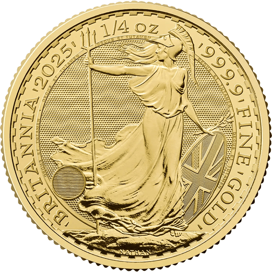 - Revers : Met en valeur le célèbre motif Britannia, symbole de force et de résilience. L’image intègre des dispositifs de sécurité avancés comme la micro-gravure, une image latente et une animation de surface. Les inscriptions indiquent « BRITANNIA », « 2025 », « 1/4 oz » et « 999.9 FINE GOLD ».