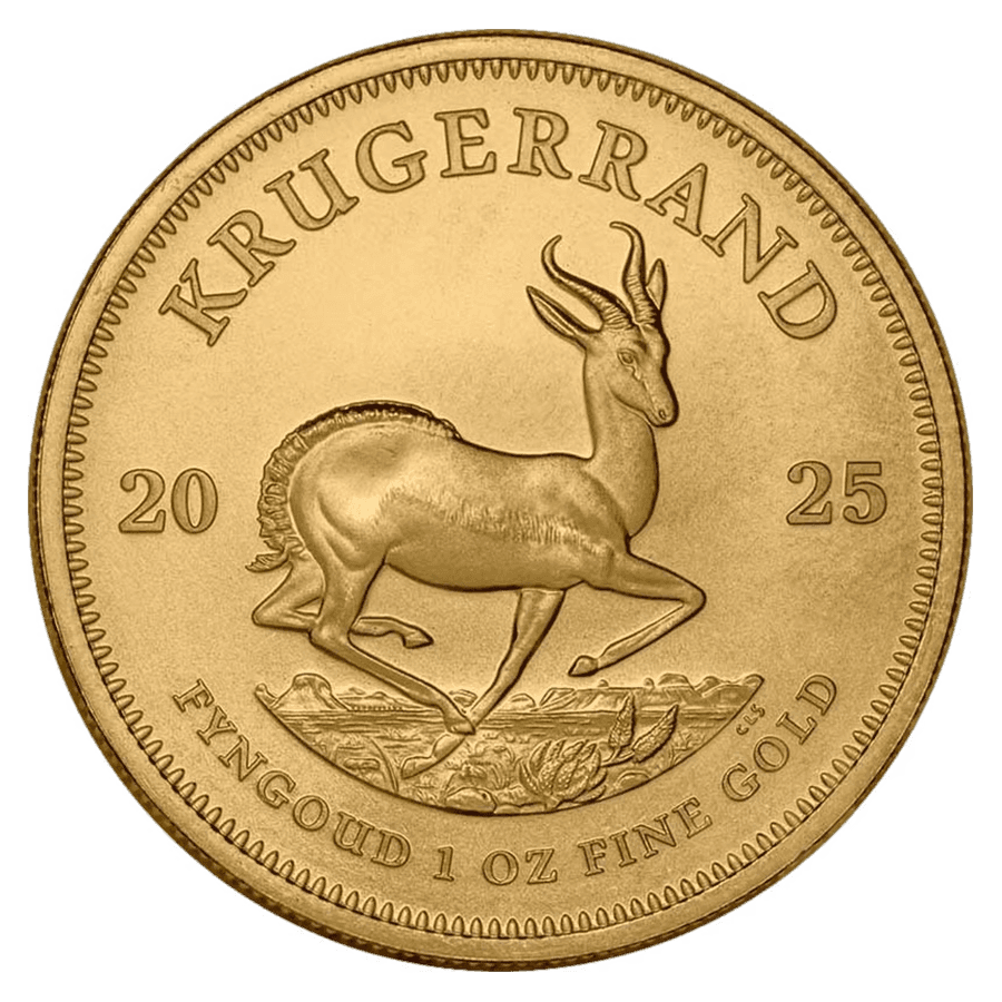 - Avers : L'avers de la pièce illustre une antilope springbok bondissante, emblème national de l'Afrique du Sud, surmontée de l'inscription « KRUGERRAND » et du millésime « 2025 » réparti de part et d'autre. En bas, l'inscription « FYNGOUD 1 OZ FINE GOLD » met en avant sa composition. Une bordure pointillée encadre le design, rendant hommage à cette pièce emblématique de 1 once d'or.